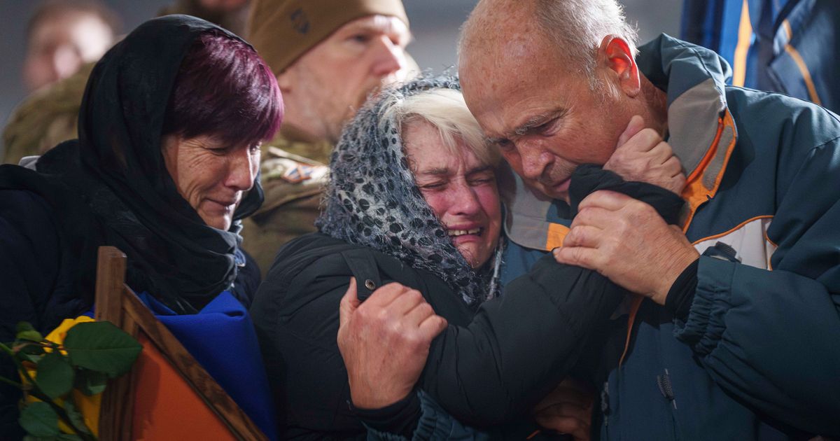 A crowd of mourners lit torches and intoned a military chant to honor a Ukrainian medic and a soldier who fell in love while on the frontlines of the war and died together in a Russian shelling attack.