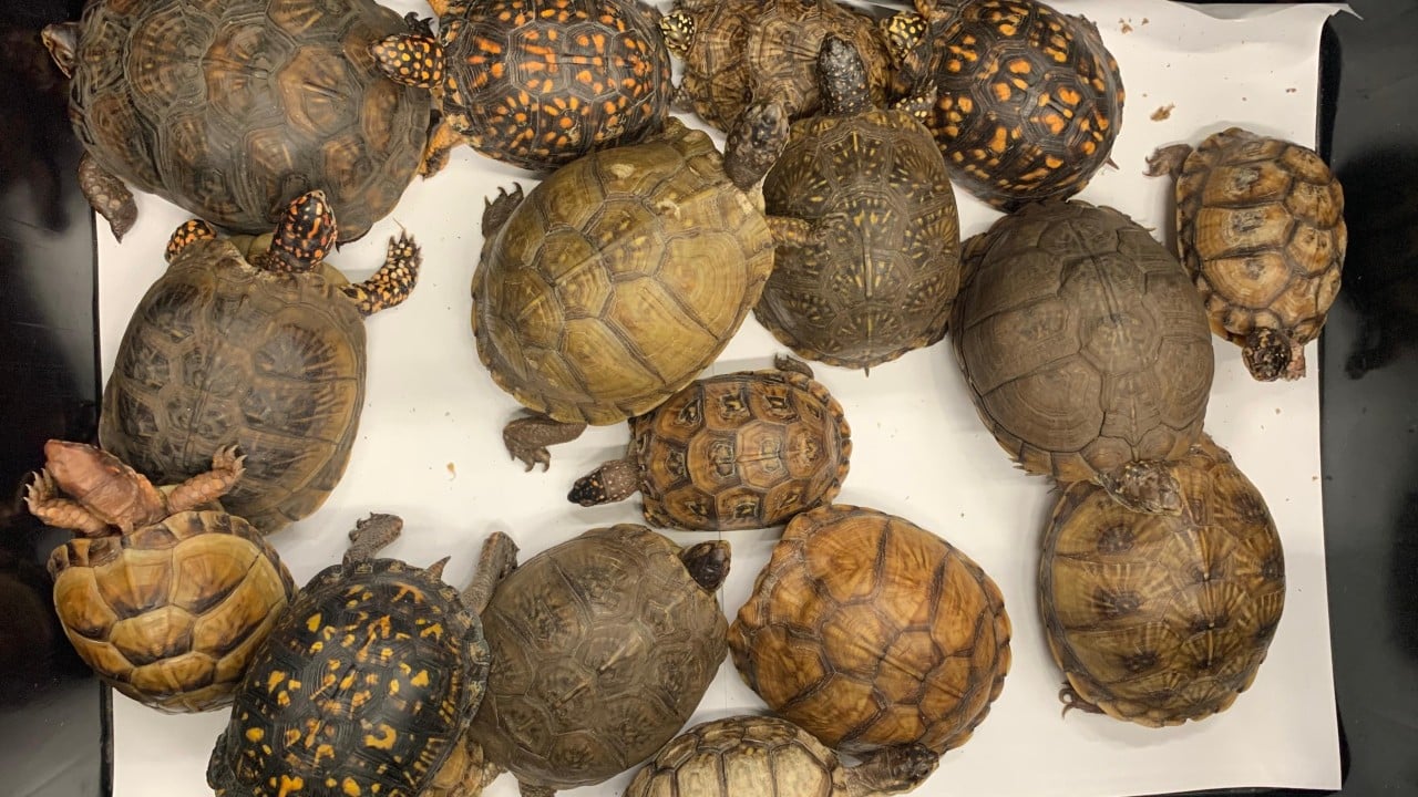 Customs officers arrest 50-year-old male passenger over tiger teeth and pangolin meat worth about HK$50,000, and 45-year-old woman over 64 live turtles worth HK$650,000.