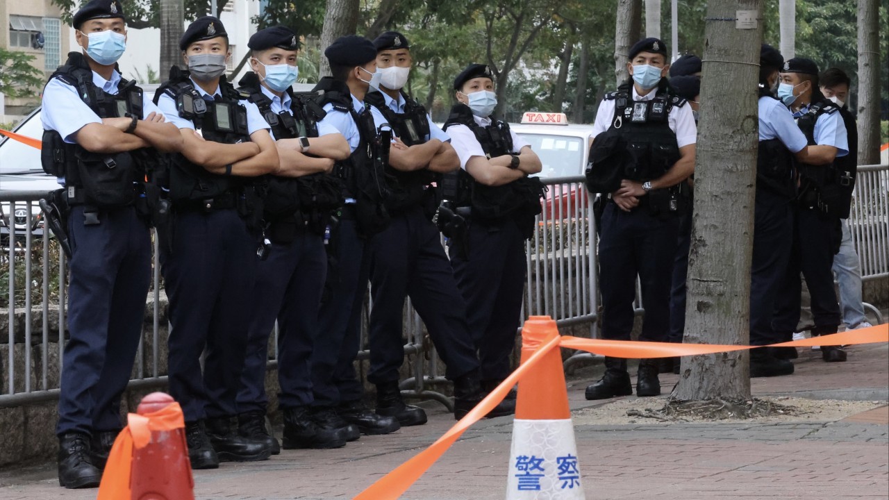 Dozens of officers in uniform and plain clothes stationed on fourth floor of complex, with entire level converted into trial-viewing area.